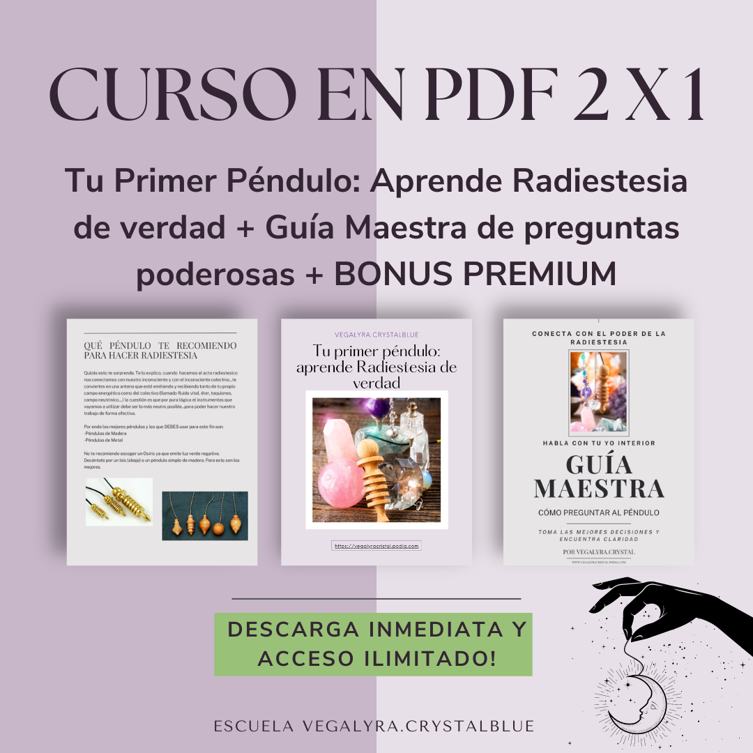 No dejes que tu péndulo se quede sin usar en un cajón. Obtén el conocimiento y las habilidades que necesitas para aprovechar al máximo su poder. Créeme, es un PDF de muchísimo más valor del que marca, aprenderás cosas que se pasan por alto en la radiestesia actual. Y además te incluyo UN BONUS increíble para que no se te resista ninguna pregunta que le hagas el péndulo!